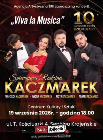 "Viva La Musica" to zupełnie nowy koncert jedynej w Polsce rodziny śpiewającej muzykę klasyczną. W wykonaniu Śpiewającej Rodziny Kaczmarek usłyszycie państwo tym razem najpiękniejsze melodie z operetki min. Wesołej wdówki, Hrabiny Marizy, Księżniczki Czardasza, czy Guditty, przeboje z musicali min: Skrzypka na dachu, My fair lady czy Upiora w operze, a także piękne standardy muzyki rozrywkowej, piosenki z repertuaru Franka Sinatry Elvisa Presleya, Poula Anki czy Luisa Armstronga.